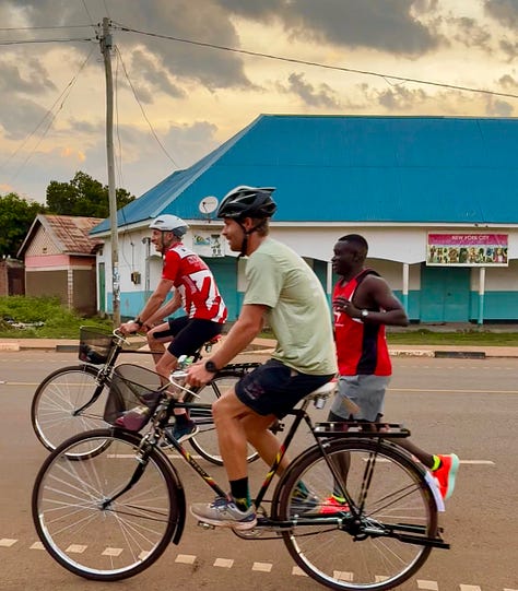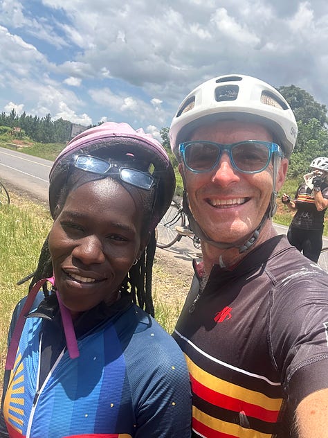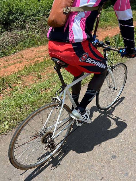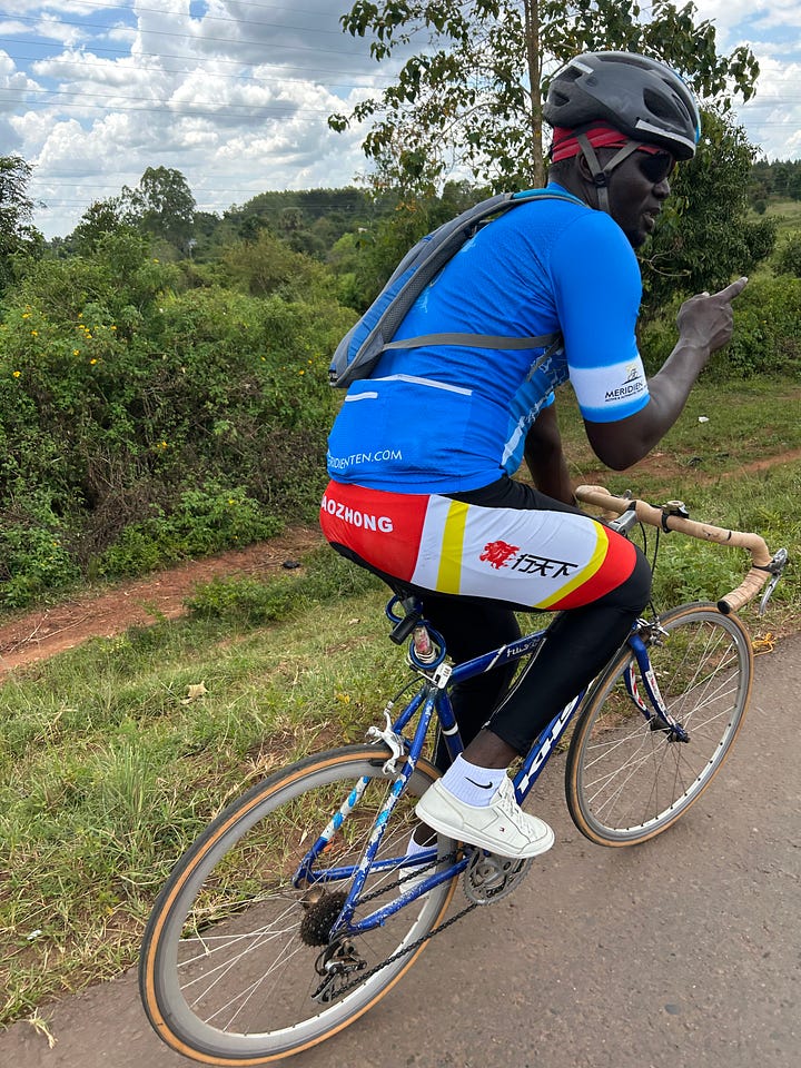 As we waited — and danced — I took longer looks at our new friends’ setups: pure whatever-works Frankenbikes, parts swapped in and out; kits evidently donated, and far over-worn: two of the three sported long sleeves and tights in the African sunshine. Their faces glistened, but no one stopped smiling, let alone complained.