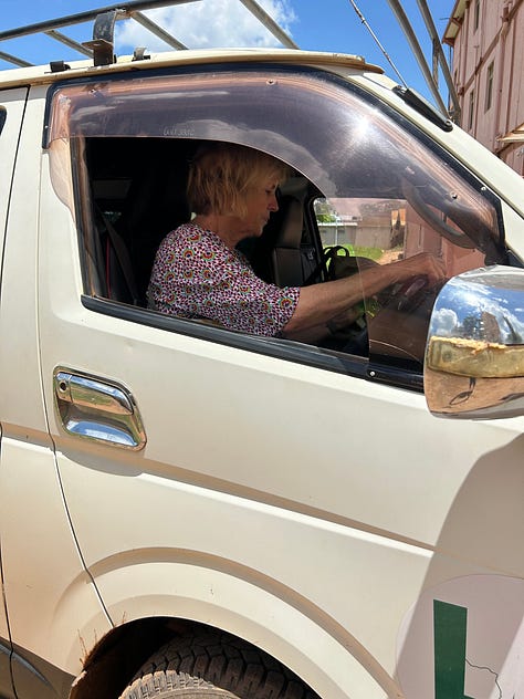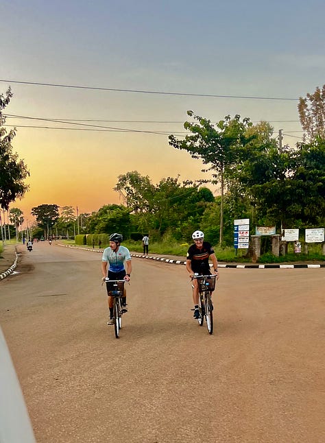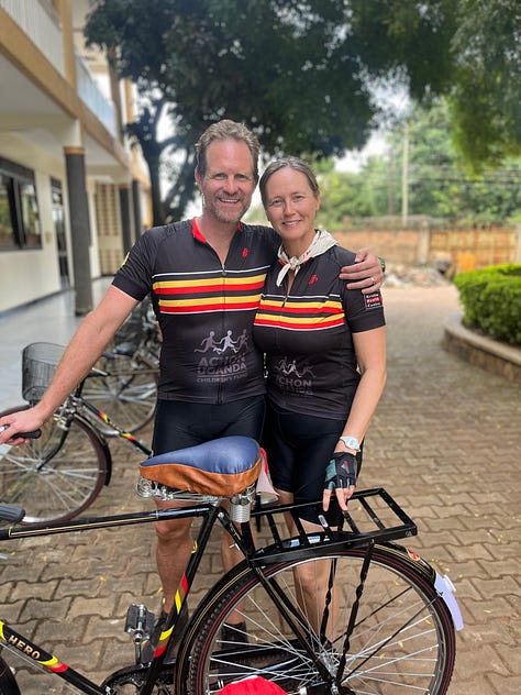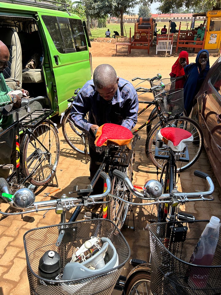 We rolled into Lira eleven strong — including Kaaya, with my mom driving the van behind me (on the left side of the road, through the town’s aggressive traffic). Catie continued playing music, the speaker in her basket; Sara kept dancing, even though the urban din mostly drowned out our tunes. We pedaled carefully, so I was able to look around: this was the first city on this trip that I’ve visited several times before. I recalled our kids’ walking through Lira market in 2016, our youngest Declan just ten years old, all three struck by the new sights — and especially the new odors — but no one feeling unsafe. Same with Karen, my mom, Declan and his high school friends in 2023, getting caught while walking in a drenching downpour; Kaaya and I went searching for them in the van, concerned, and found them in a “wine bar” — the kids drinking Smirnoff Ices, well cared for by the proprietor. (It’s OK — if there’s a legal drinking age here, it’s 18 max.)