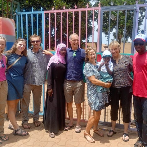 Karen and I once envisioned a group of 25 friends and family members joining us, but we ended with a core group of eight: me and Karen; Mack, his girlfriend Jesse, and our daughter Catie; our friends Travis and Heather; and remarkably, my mom Angela, who is here on her tenth trip to Uganda, and who next year will celebrate her 80th birthday.