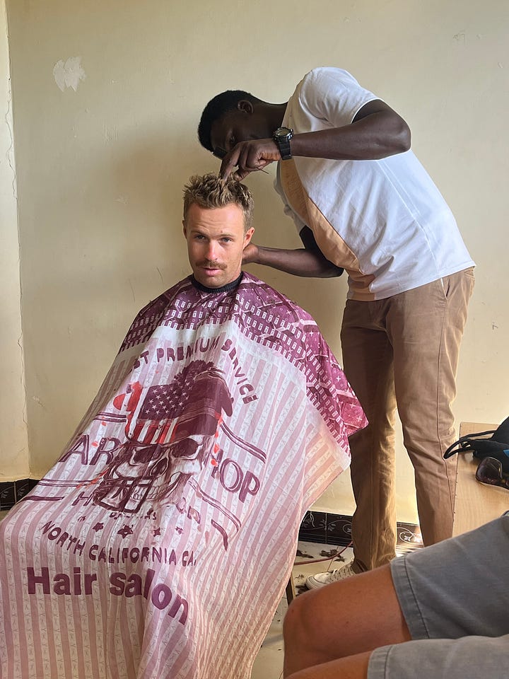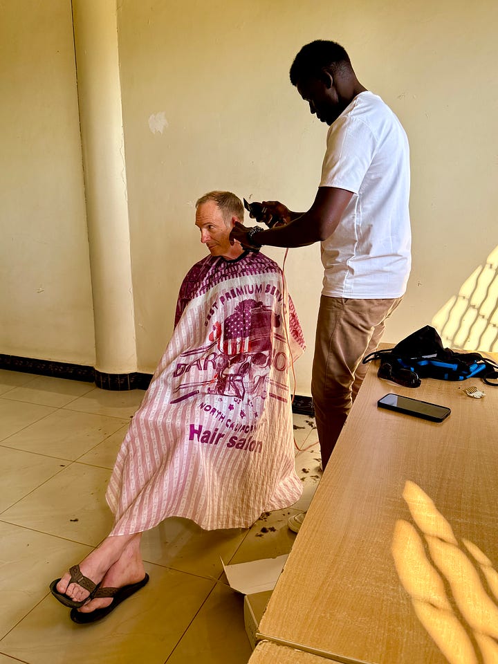 Turns out Derrick cuts hair to earn a few shillings. Travis, Mack and I all took him up on his offer.