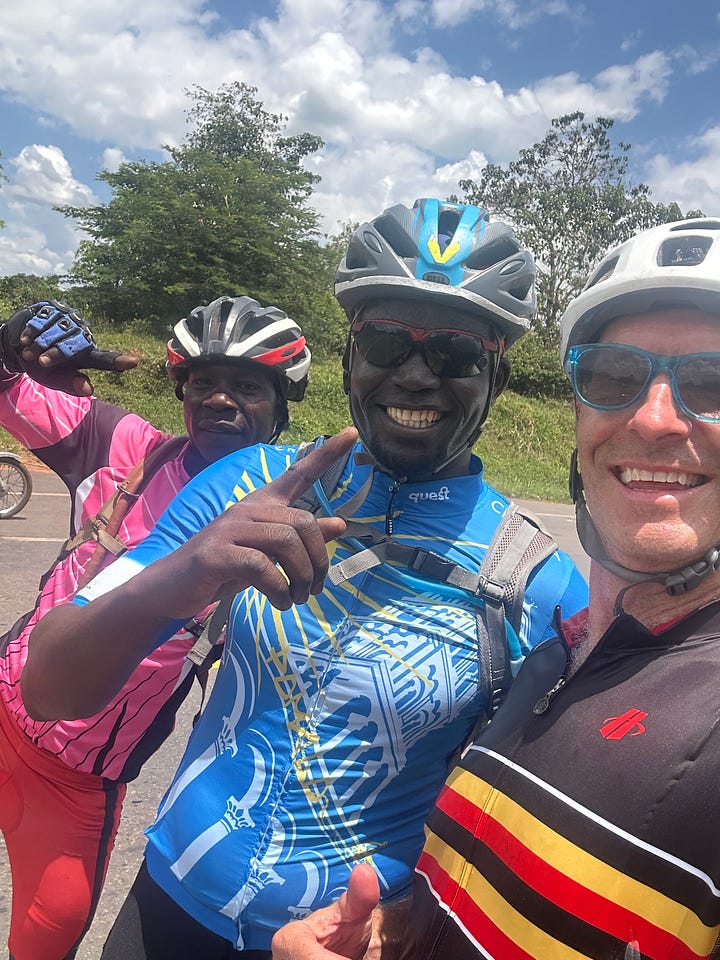 We were all extremely ready to be finished when we received an emotional boost that we felt immediately in our legs: riding in the other direction I spotted three “real” cyclists, clad in lycra and pedaling skinny-tire bikes. I knew whom they must be: I’d connected through a Lira-based friend with the local cycling group, and invited them to ride our route in reverse until they saw us. Here they were: three cyclists aboard the veto-equivalent of the thousands of cars we’d seen since departing Jinja: rusted, cobbled together, but functional.